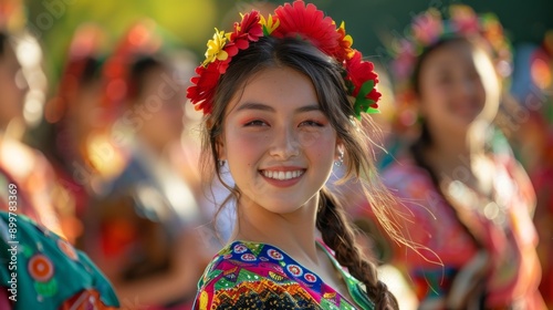 group of people from different Asian Pacific cultures participating in a traditional dance, wearing colorful attire and sharing smiles and laughter in a scenic outdoor
