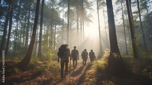 Group of people hiking enjoying the green Scenery through beautiful green forest