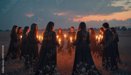 Group of people in black robes holding candles in a field at sunset
