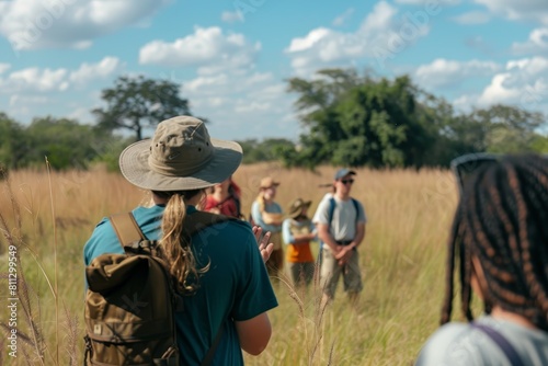 Group of people led by a professor in a safari hat, standing in a field, A professor in a safari hat, leading a group of students on a field trip