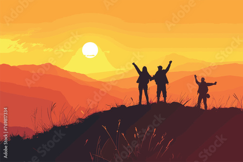 Group of people on the mountain, Silhouettes of happy friends sunset background, Group of friends in the sunset