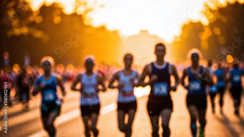 Group of people running a marathon at golden hour, defocused