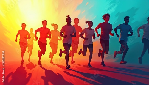 Group of people running fast in vibrant colors. Dynamic image of runners in motion. Energy, sport lifestyle concept. Colorful abstract illustration. People run towards vibrant background. Sunrise