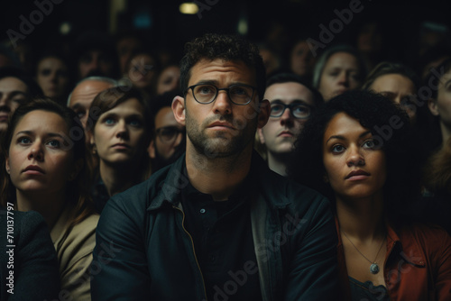 Group of people sitting together in front of large crowd. Team meetings, conferences, seminars, or any gathering where group is seated in front of audience.