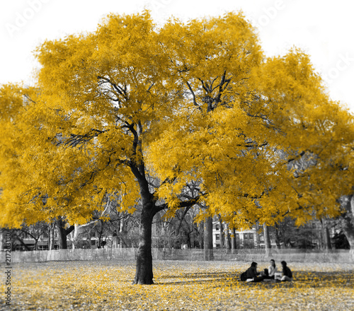 Group of people sitting under a golden yellow tree in a black and white landscape in New York City