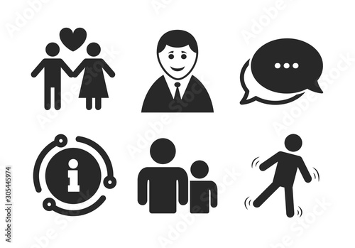Group of people symbol. Chat, info sign. Businessman person icon. Man love Woman or Lovers sign. Caution slippery. Classic style speech bubble icon. Vector