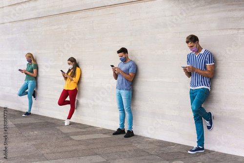Group of people using their mobile phones waiting in line while keeping social distance - Coronavirus lifestyle - Focus on right man hands