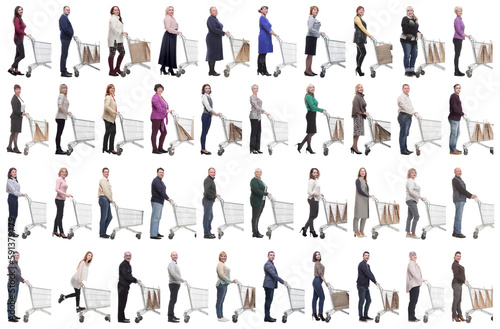 group of people with cart looking at camera isolated