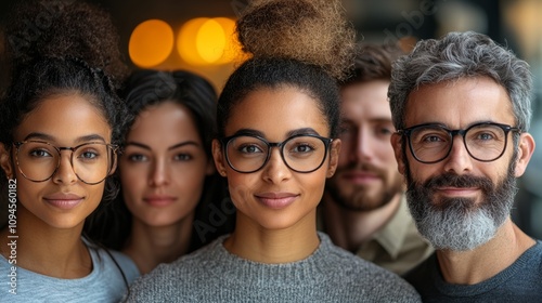 Group of people with glasses are standing together. Scene is friendly and welcoming