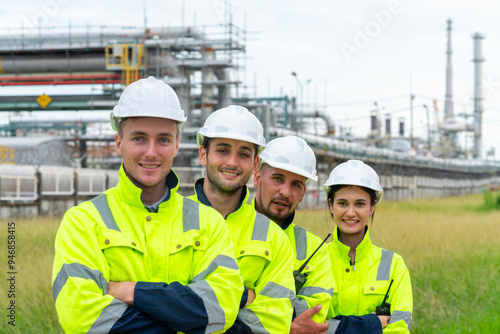 Group of Petrochemical engineers teamwork working together at petroleum oil refinery industry area. Industrial technician worker maintenance inspect manufacturing energy power gas system at factory.
