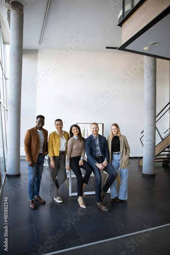 Group of positive businesspeople standing together in the office