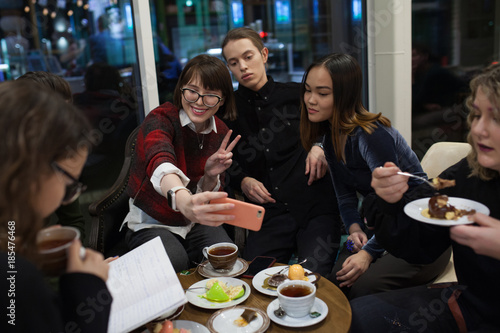 Group of positive teenagers make selfies and spending time in a cafe.