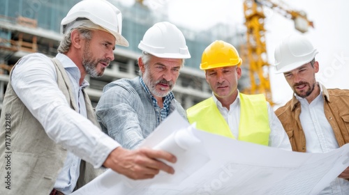 Group of professionals reviewing blueprints at a construction site to ensure project success and safety.