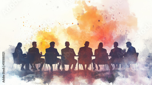 group of professionals seated in breakout room, engaged in discussion. vibrant colors and silhouettes create dynamic atmosphere of collaboration and creativity