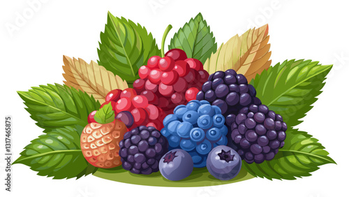 Group of ripe forest berries: blueberry, blackberry and raspberry lying on a leaf, isolated on a transparent background.