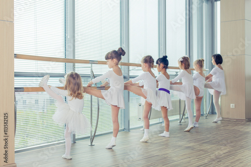 Group of seven little ballerinas standing in row and practicing ballet using stick on the wall