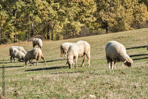 Group of sheep grazing on mountain meadow in sunny autumn day
