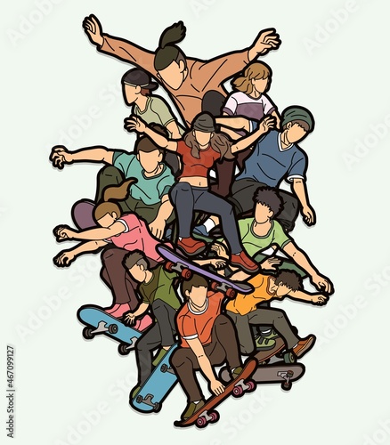 Group of Skateboarder Playing Skateboard Together Extreme Sport Cartoon Graphic Vector