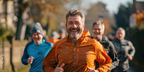 Group of smiling men running outdoors together, showcasing fitness, camaraderie, and the joy of exercising in a natural environment.