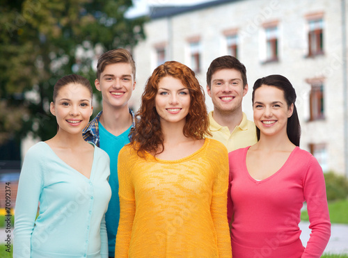 group of smiling teenagers over campus background