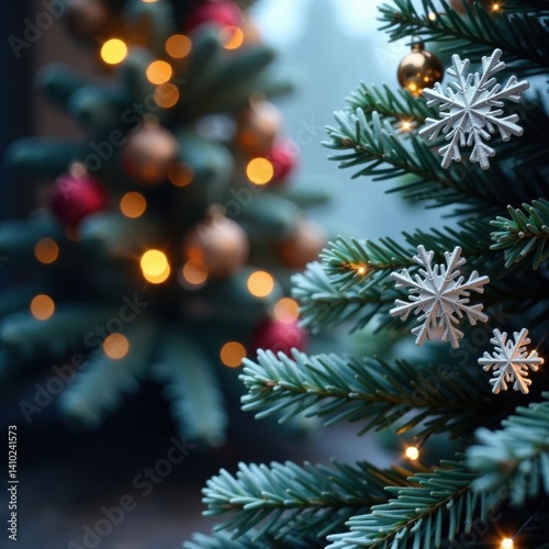 Group of snowflakes falling gently on a festive Christmas tree, frosty, christmas tree, ornaments