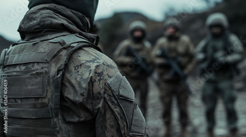 group of soldier in remote mountain military operation taking instruction from senior before attack