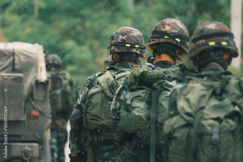 Group of soldiers wearing camouflage uniforms and helmets walking outdoors with military gear and backpacks during training or mission.