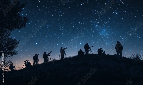 Group of stargazers with telescopes on a serene hilltop, stars glowing vividly in the clear night sky.