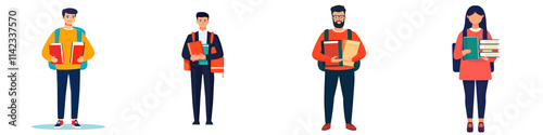 Group of students and professors in an academic setting using books laptops and other educational supplies and technology Concept of learning studying