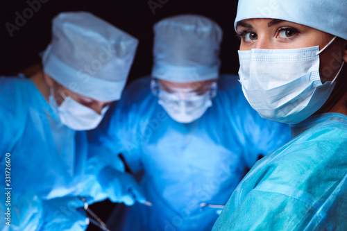 Group of surgeons wearing safety masks performing operation. Medicine concept