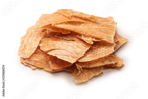 Group of tasty beer snacks. Dehydrated chicken meat slices.