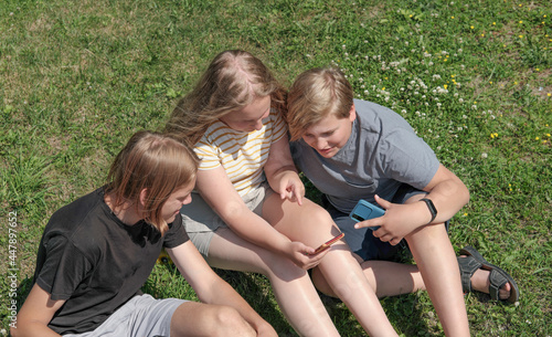 group of teenagers looking at smartphone screen and smiling and chatting. teens sitting on a lawn grass wearing casual clothes spending time outdoors