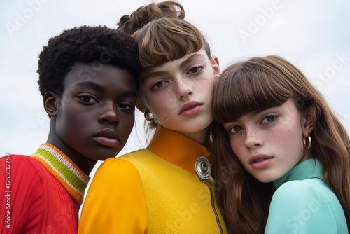 Group of teenagers showcase vibrant mod fashion styles in a contemporary outdoor setting during daylight hours