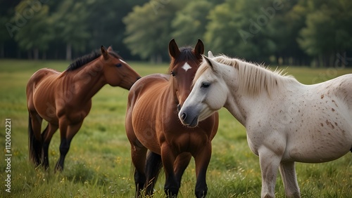 Group of three young horses on the pastu