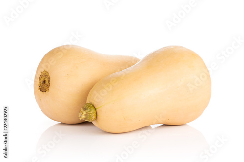 Group of two whole smooth pear shaped orange butternut squash waltham variety isolated on white background