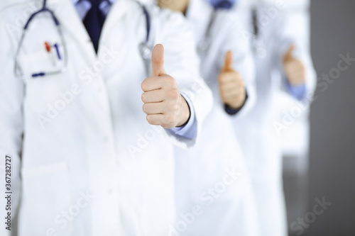 Group of unknown doctors stand as a team with thumbs up in a hospital office. Physicians ready to examine and help patients. Medical help, insurance in health care, best desease treatment and medicine