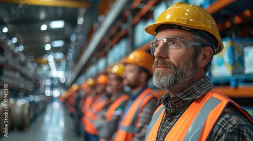 Group of warehouse workers wearing safety gear, standing in line, highlighting teamwork and focus in an industrial setting.