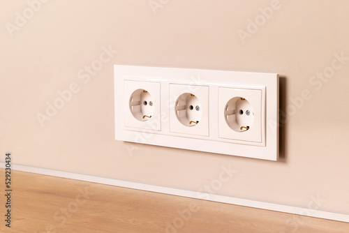 Group of white european electrical outlets on modern beige wall. Selective focus