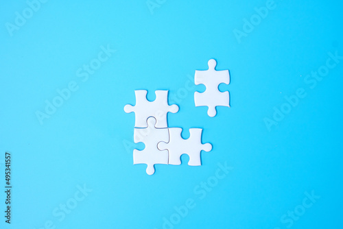 Group of white puzzle jigsaw pieces on blue background. Concept of solutions, mission, success, goals, cooperation, partnership, strategy and puzzle day