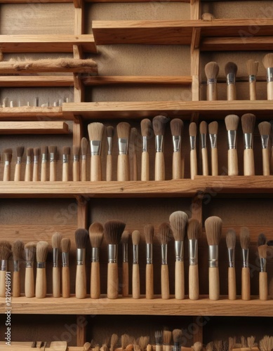 Group of wooden brushes for different purposes arranged on wooden shelves, household, assorted