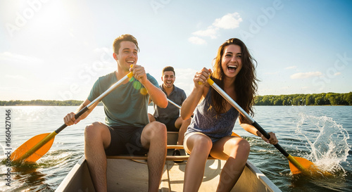 Group of Young Friends Laughing and Paddling Canoe on Summer Day