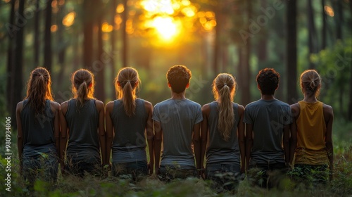 Group of young people enjoying a sunset while standing in a forest during summer evening