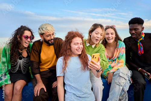 Group of young people friends using cell phones outdoors watching something funny. Concept of community millennial people addicted to technology. Social Media communication generation Z