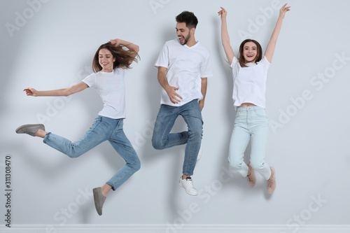 Group of young people in stylish jeans jumping near light wall