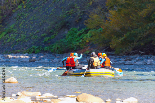 Group of young people make a rafting on mountain river