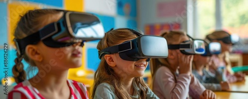 Group of young students in a colorful classroom, using VR headsets for an immersive learning experience, exploring virtual worlds together