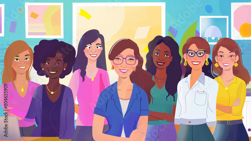 Group portrait of adorable young smiling woman posing together flat illustration. Colorful female business team is on the office. Funny cute office workers or colleagues. Women's day. Feminist agenda.