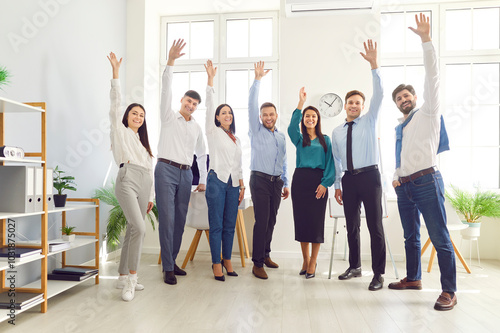 Group portrait of an office team of colleagues celebrating success, with everyone raising hands in jubilation. Employees crowd reflects the teamwork and achievement in the business environment.
