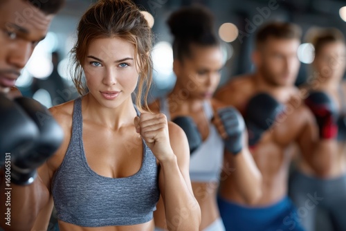 Group training session in a boxing gym featuring focused individuals preparing for workouts