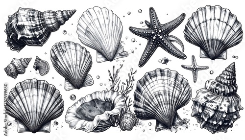 Grouping of various seashells and starfish in detailed grayscale illustration